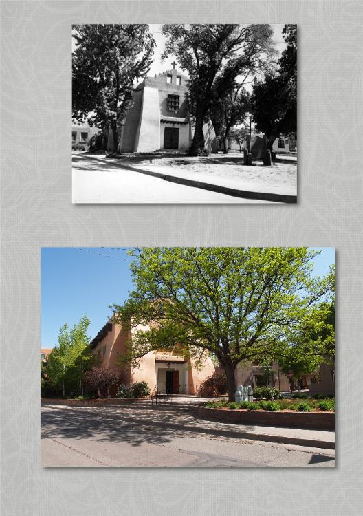 Around the corner and down the block we find the next photo. The First Presbyterian Church. This photo was originally incorrectly identified by Kathy as the UNM Alumni Church, and apparently she is not the only one who thought that. Many people blogged that they were so sure of the location that they didn’t even realize it was not the correct location for this photo until they arrived at the UNM Alumni Chruch and began to take the photo. After reading these comments, I began to search again and that is when I found it here in Santa Fe. Built in 1939 |