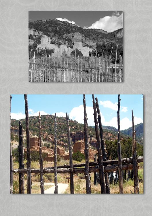 | Just a few blocks down the road from that photo was the next photo, Jemez State Monument. The photo was taken from the parking lot looking through a fence made of branches. Again we just pulled into the parking lot, snapped the photo and headed off. This is another location that normally Jim and I would have stopped to tour had it not been so HOT! Oh, did I mention earlier that it was HOT!. I do need to go back and get photos of this Monument for another scrapbook project, but we will save that for a day trip when it is cooler. |